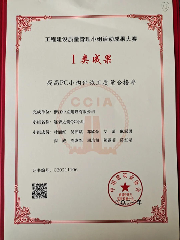近日,從中建協(xié)傳來喜訊,中立公司逐夢之筑QC小組獲工程建設(shè)質(zhì)量管理小組活動成果大賽Ⅰ類成果。今年我公司QC成果取得豐碩成績,另外樹人之心QC小組獲得浙江省優(yōu)秀QC成果一等獎1項、同心同行QC小組獲浙江省優(yōu)秀質(zhì)量管理小組。