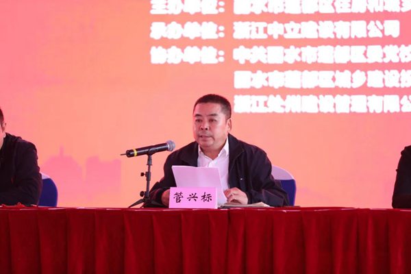 蓮都區(qū)副區(qū)長管興標、蓮都區(qū)建設(shè)局副局長吳大勇、蓮都區(qū)委黨校常務(wù)副校長陸朝霞、區(qū)建投公司副經(jīng)理劉良、浙江中立建設(shè)有限公司董事長周健、浙江處州監(jiān)理總經(jīng)理王建武主席臺就座,蓮都區(qū)建筑施工、監(jiān)理企業(yè)代表及相關(guān)主管部門代表參加觀摩會。